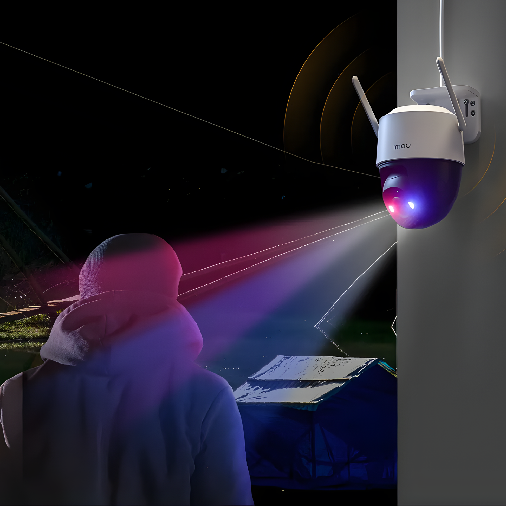 When an intruder is detected, flashing police-style lights activate for strong visual deterrence.